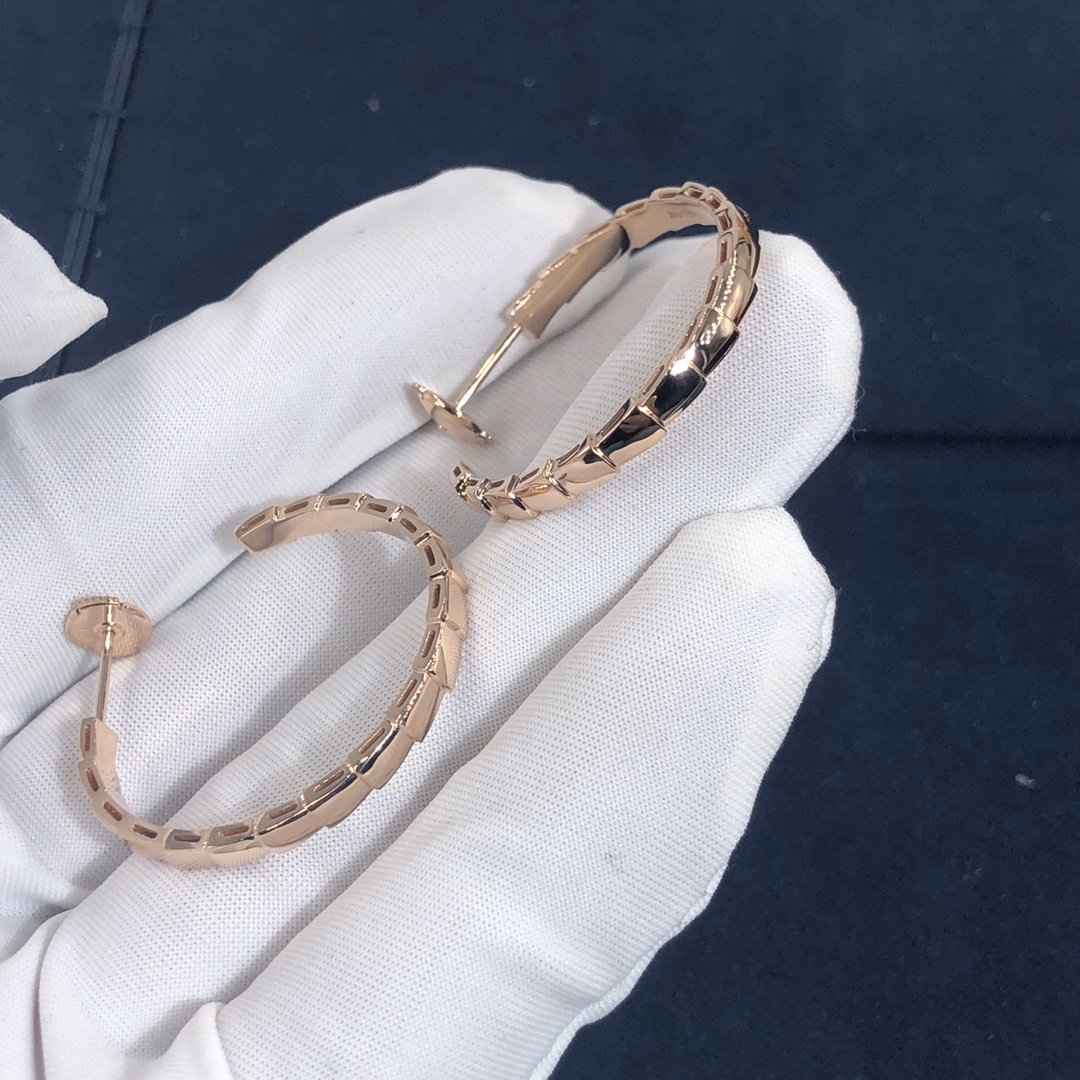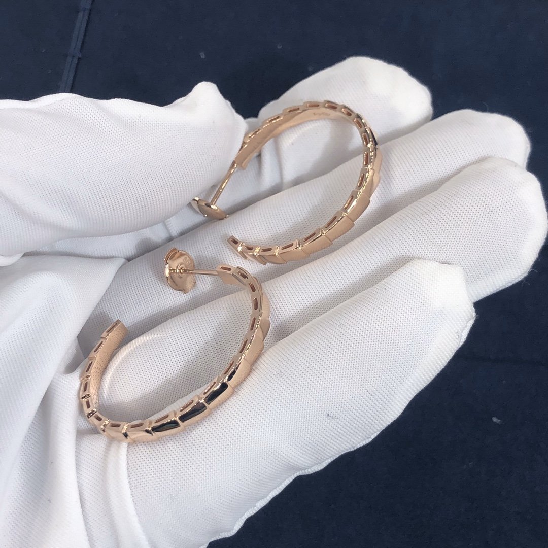 أقراط أفعى بولغاري سيربنتي مصنوع خصيصًا من الذهب الوردي عيار 18 قيراطًا. مستوحى من الحركة الحلزونية للأفعى قبل ضربها, تستحضر الأقراط هذا الملف الحسي من خلال الجمع بين الجمال الخطير للمقاييس الثمينة وانسيابية الثعبان. في لعبة ساحرة بين الضوء والظل, المعرفة والرغبة, الإغراء والرغبة, يتم الكشف عن وجهين لا يقاومان لطبيعة الثعبان من خلال تصميم آسر.